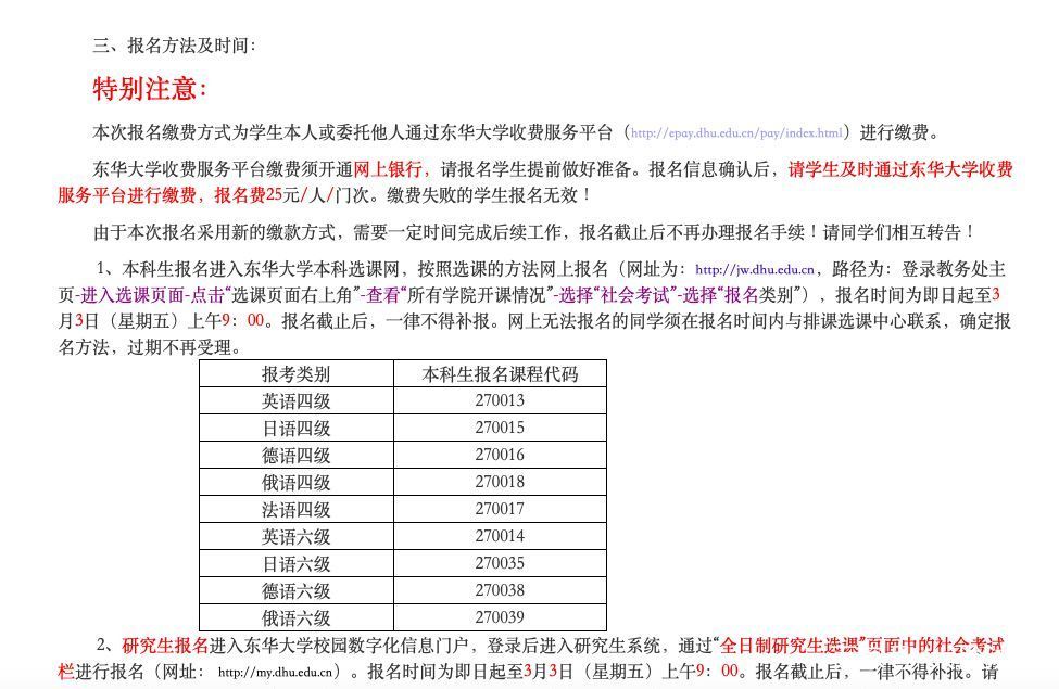 这是东华大学教务处官网的通知,所以大家找自己学校的四六级报名通知就可以获取相关报名信息,如果自己学校没有法语系的话,可以去市内其他有法语系的高校进行报名考试。